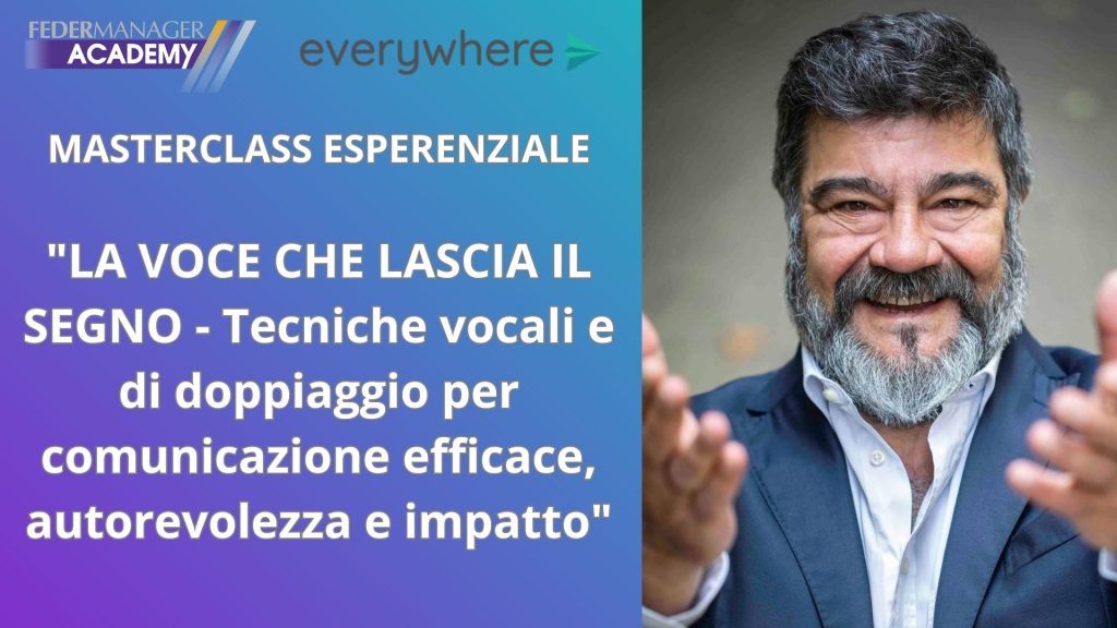 Non una semplice lezione sulla comunicazione, ma un'esperienza che unisce ispirazione e applicazione concreta. Francesco Pannofino porterà esempi, retroscena e aneddoti tratti dalla sua straordinaria carriera tra cinema, teatro e doppiaggio, mostrando cosa significa davvero usare la voce per lasciare un segno. Accanto a lui, un coach esperto guiderà i partecipanti in un percorso pratico e strutturato, trasformando gli spunti artistici in strumenti immediatamente applicabili in azienda: più presenza, più autorevolezza, più impatto nelle relazioni professionali. Perché la differenza tra parlare e farsi ascoltare può cambiare il modo in cui lavori, guidi e comunichi ogni giorno. Finanziabile tramite Fondi Interprofessionali. In collaborazione con Everywhere.